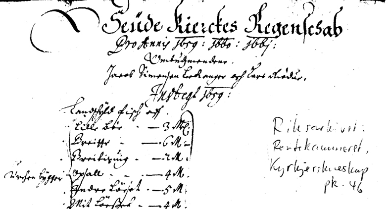 Illustrasjonen under er ein fotokopi frå Riksarkivet av ein del av original protokollside frå rekneskapsbøkene til Syvdekyrkja – Olavskyrkja – frå 1660-talet.