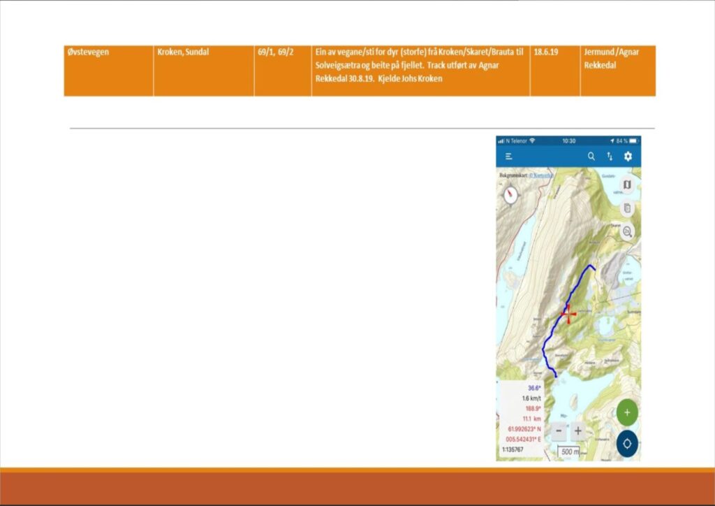 | Beskriving | Ein av vegane/sti for dyr frå Kroken/Skaret/Brauta til Solveigsætra og beite på fjellet. Track utført av Agnar Rekkedal 30.8.19. Kjelde Johs Kroken. |