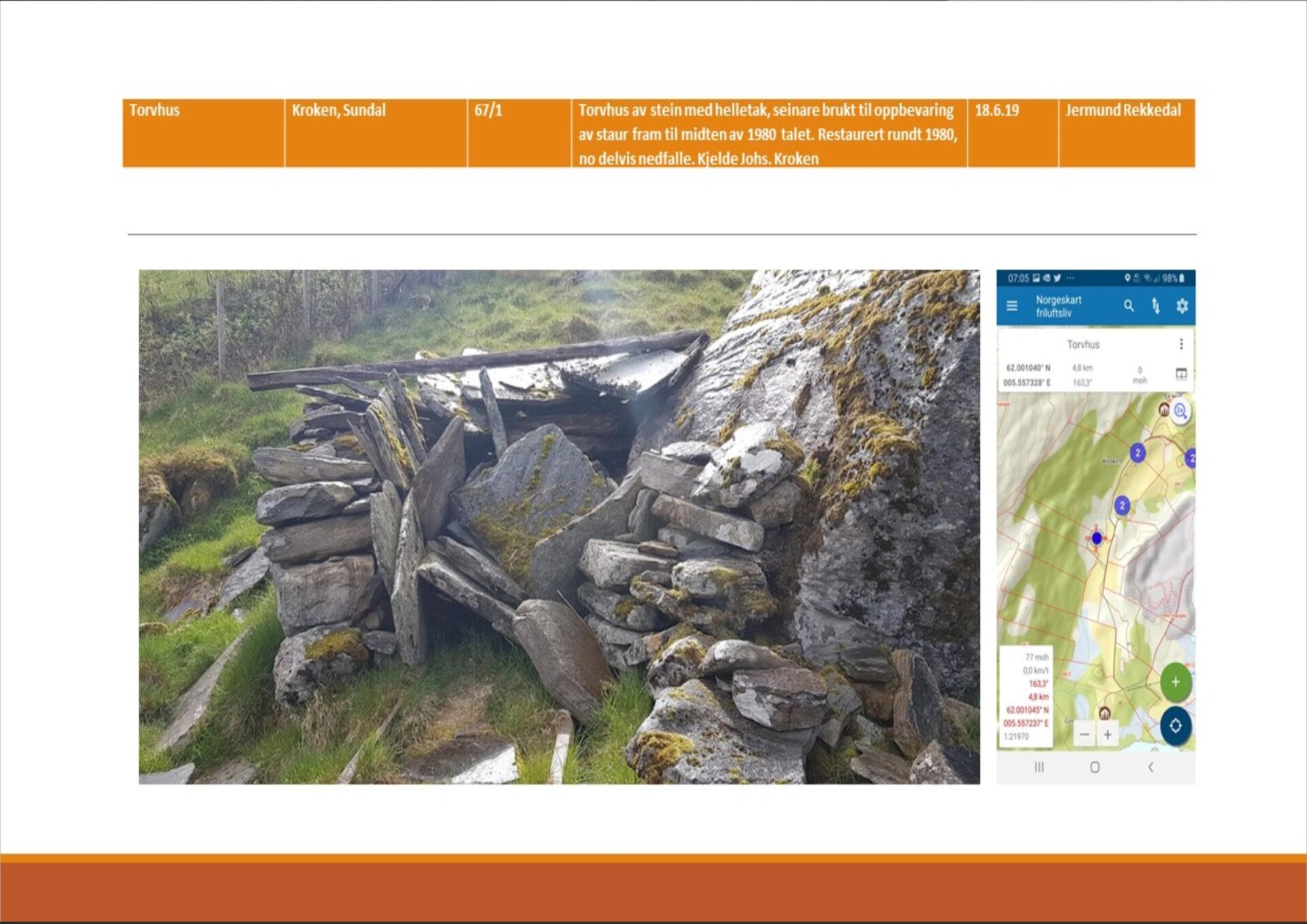 BeskrivingKroken, Sundal 67/1 Torvhus/ Vakthytte av stein med helletak, seinare brukt til oppbevaring av staur fram til midten av 1980 talet. Restaurert rundt 1980, no delvis nedfalle. Kjelde Johs. Kroken.