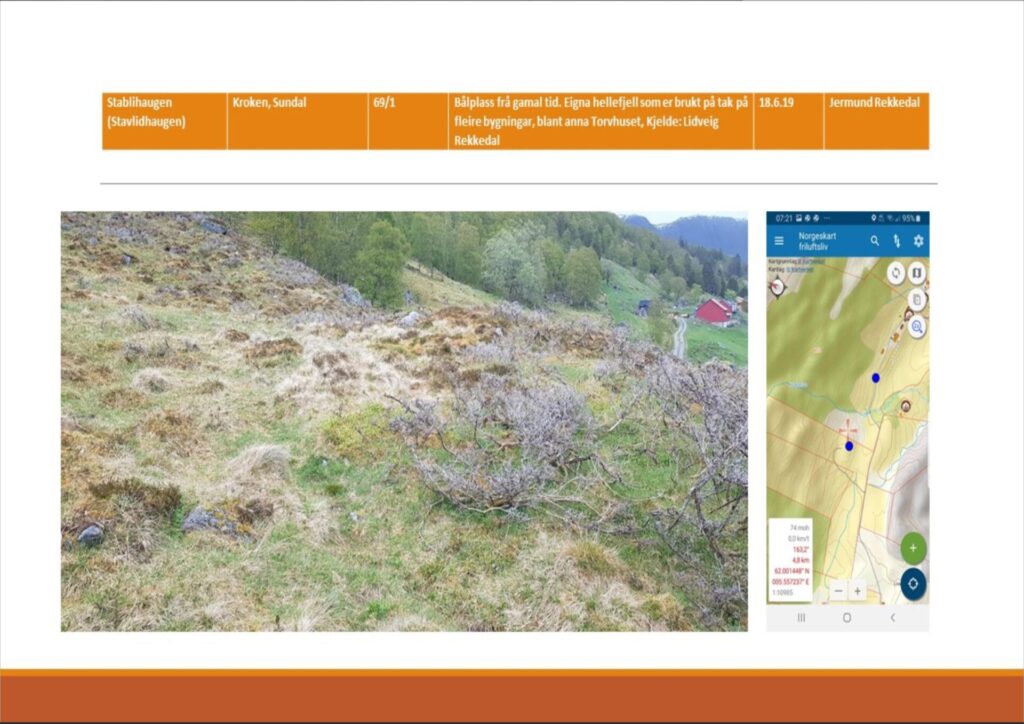 | Beskriving | Kroken, Sundal 69/1 - Bålplass frå gamal tid. Eigna hellefjell som er brukt på tak på fleire bygningar, blant anna Torvhuset/Vakthuset, Kjelde Lidveig Rekkedal. |