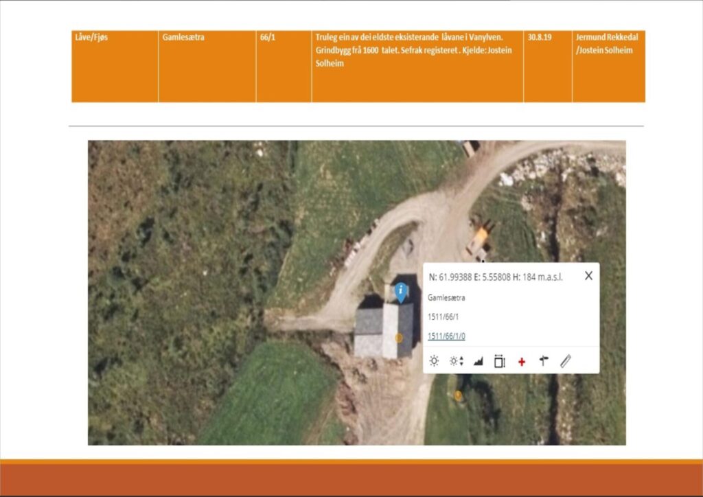 BeskrivingGamlesætra 66/1. Truleg ein av dei eldste eksisterande låvane i Vanylven. Grindbygg frå 1600 talet. Sefrak registeret. Kjelde: Jostein Solheim.
